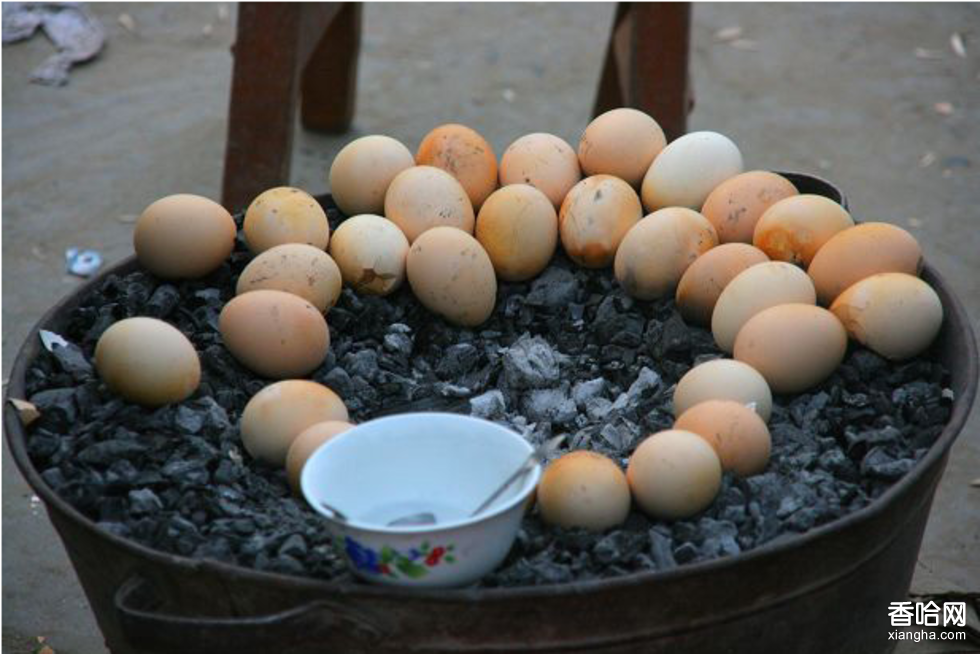 烤雞蛋,是和田巴扎上所特有的。防在撒了灰的碳火上慢慢的烤,不停的翻動,火候一定要掌握好,否則雞蛋會0,弄的蛋黃四濺。這樣烤出來的雞蛋蛋清細膩、爽口,蛋黃有一股淡淡的焦香,是一種能記住一輩子的味道。
