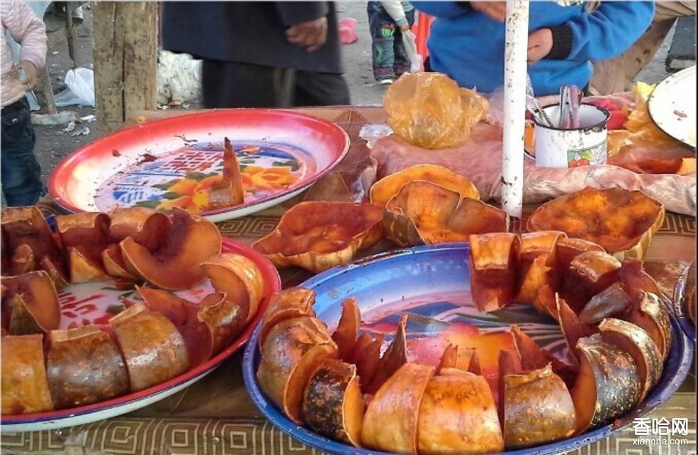 南瓜在新疆維吾爾語里成為“卡瓦”,烤南瓜在喀什也是很多見的了,在巴扎里,你能看到一個大推車上放著很多被切成瓣的南瓜,不到跟前,你就可以聞到一陣陣南瓜的香氣,這種香味也只有烤南瓜所獨有的了。