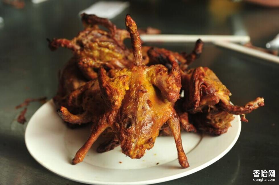 廚師通常都是把穿好的一串串乳鴿塊放入用雞蛋、淀粉配制好的調(diào)料里浸泡幾分鐘后,再上烤架。有整只烤的,也有分解為半只或四分之一進行烤的。炙烤的炭火是事先準備好的杏樹、桑樹木炭,在烤制過程中再加鹽、白胡椒、孜然等調(diào)味品,并不時翻動烤架上的乳鴿串,幾分鐘后,鴿子就變成了金黃色,噗噗地滲出了油,令人垂涎難忘。