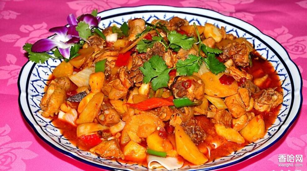 新疆大盤雞是新疆地區(qū)名菜,大約起源于80年代后期,主要用料為雞塊和土豆塊,配皮帶面烹飪而成。新疆大盤雞色彩鮮艷,有爽滑麻辣的雞肉和軟糯甜潤的土豆,辣中有香,粗中帶細,而且經(jīng)濟實惠,親朋聚會食用尚家。