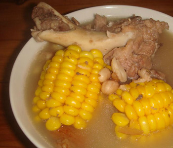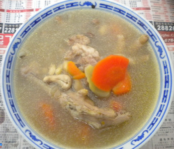 3、鍋內(nèi)放水,用旺火燒開,放入以上各用料再燒,慢火煮3小時(shí),視豬骨、雞腳酥爛時(shí)下精鹽調(diào)味即成。