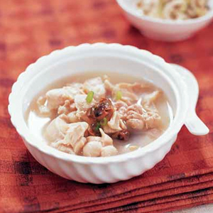 2、另起鍋注入清水,將汆燙好的兔肉塊和冬瓜塊放入鍋里,燒開后滴入幾滴紹酒,用文火燉至兔肉熟爛。