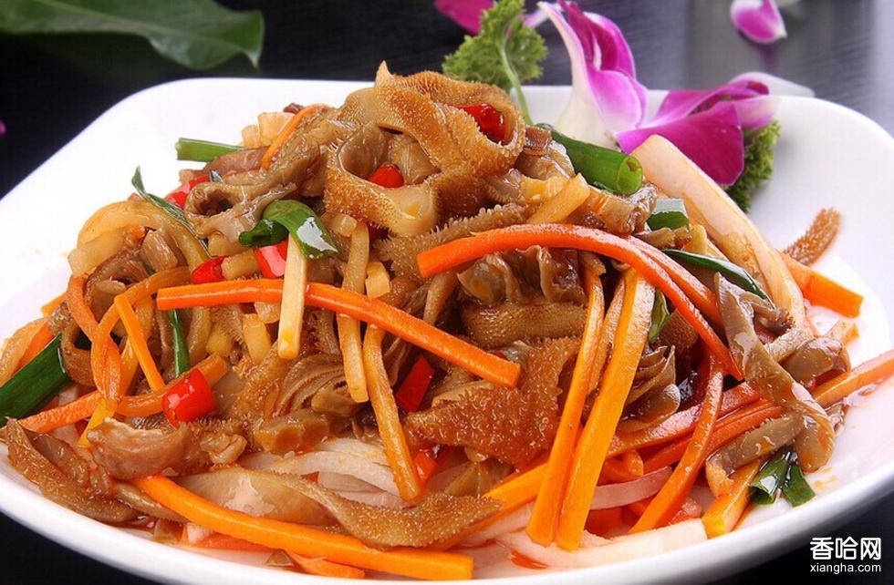 1.羊肚放進(jìn)開(kāi)水中燙熟,撈出,切細(xì)絲;