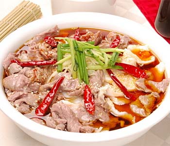 7、大火1分鐘小火5分鐘,最后將鍋中的食材倒入盛有豆芽、金針菇等的大碗中,水煮肉片就完成了。