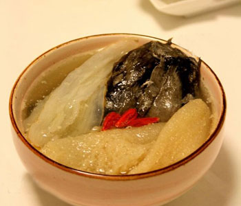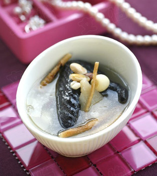 點評:烏雞湯的經(jīng)典做法,不僅是粵菜中有,閩菜中也有?;ㄆ靺⒓由虾5滓?、蟲草花一起燉烏雞,可以滋陰養(yǎng)肺,清火。