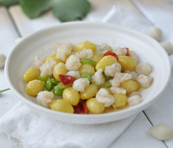 簡(jiǎn)單的將白果用火烤熟,見(jiàn)其爆開(kāi)就可食用,清瑩如玉,氣味很香,口感軟糯;小吃中用來(lái)做甜菜,桂花白果,冰糖白果;菜肴中常將它和香菇一同煮熟調(diào)味,冷下來(lái)后作冷菜用,或?qū)⑺c雞一同燉、燒,白果燒雞是揚(yáng)州很常見(jiàn)的家常菜。不論作何用途,白果做菜通常以清淡的顏色為主,不宜濃油赤醬的調(diào)味。