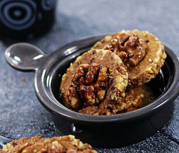 材料:低筋面粉、黃油、紅糖、核桃仁、雞蛋、奶油焦糖醬