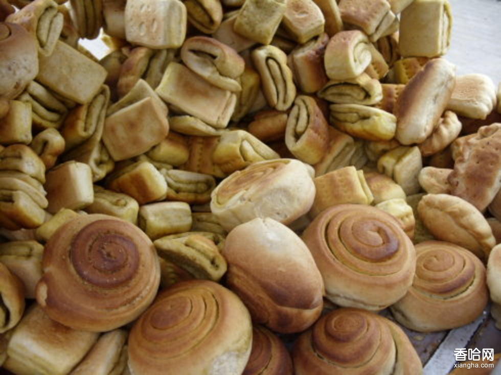 用酵母把面發(fā)好對適量堿,將干羊糞在門外堆成一堆點著燒,羊糞全部燒過不冒煙時,把面搟成燒鍋大小圓形,放入熱鍋內(nèi)蓋上蓋,扒開燒好的火堆,把燒鍋埋入火內(nèi)。燒鍋系生鐵鑄成,形狀似帶蓋的圓鐵盒,蓋中間有挑蓋的耳子,有大有小。埋入火中,由于上下左右四面加溫,里面的燒餅上下和邊緣都上火,烤得黃而脆。裕固族把這種烤餅叫燒殼子。有烤成燒鍋一般大的,也有一個個小的,大的吃時用刀切成塊。燒殼子吃時香而脆,冬天出門帶上不會凍住,再則不易破碎。