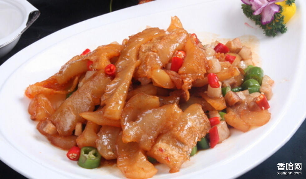 羊蹄筋150 克,木耳15 克,黃花15 克,生姜2.5 克,清油500 克,胡椒粉2.5 克,堿面100 克,花椒粉2.5 克,水淀粉40 克,食鹽2.5 克,雞湯500 克,味精0.5 克,蔥白25 克,香油10 克,蘋果1個,蒜瓣5 克、烹制方法:1.將蹄筋放在柴火上撩去毛,然后把堿面放清水盆中,視溶解后,將蹄筋投水中刷洗干凈,瀝水晾干。2.鍋坐火上燒熱,加清油400 克,改微火,乘涼將蹄筋加入油鍋,浸泡約20 分鐘,使油慢慢浸入筋內(nèi),油溫至八成熟時,將蹄筋撈人清水鍋中,用微火邊燒邊泡,視水燒開后,撈出用刀刮凈,將蹄筋順長剖二,切成3 厘米長的小段,整齊地碼在碗中,加食鹽和其它調(diào)料,澆雞湯半斤,上籠蒸約20 分鐘,潷湯,翻扣盤中。3.將木耳和黃花水發(fā),摘洗干凈。將玉蘭片、木耳撕碎,黃花切成小段,蔥切段,蒜切片,然后把炒勺坐在火上,加清水100 克,用蔥、姜、蒜熗鍋,加雞湯250 克,再將木耳、黃花、玉蘭片放入勺內(nèi),視水沸后撇去浮沫,加入味精,用淀粉勾芡,澆入蹄筋盤內(nèi),淋香油上桌。