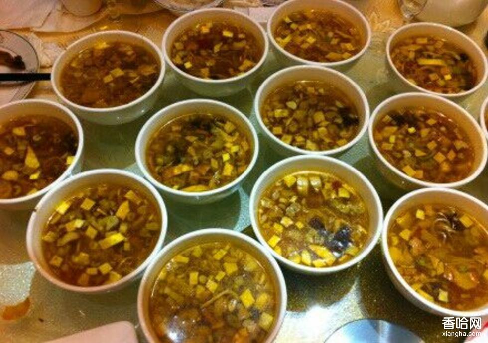 選鐵鍋?zhàn)詈茫⑶逅?,旺火沸騰,放入肉臊子,再讓水沸騰。后將準(zhǔn)備的木耳、雞蛋、黃花菜、底菜入鍋,并根據(jù)需要再行調(diào)味,旺火滾沸后文火熱之,加漂菜。湯要注意色正,即紅,鮮,亮。湯味也可根據(jù)口味微調(diào),但要保持酸、辣、鮮基本口味,湯成。將熱湯澆到剛出鍋的面上即成一碗湯滑味鮮、香美可口的臊子面。配湯是臊子面的關(guān)鍵所在,所謂一碗面,七分湯,湯很重要。