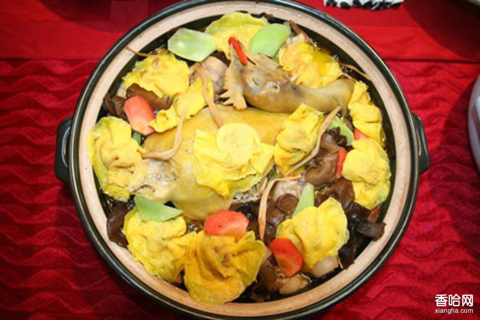 3.水海參、魷魚、香菇、玉蘭片、熟豬肚、醬肉切成小丁。生豬肉剁成肉泥,加入雞蛋4個及適量調(diào)料蒸成糕,切成丁。另將雞蛋8個磕入碗內(nèi)打散,也蒸成蛋糕,切成丁。炒鍋內(nèi)加熟豬油200克燒熱,放入姜米、蔥花炒香,再放入各種碎丁炒少許時間,加入調(diào)味品即成。另取鍋放水、母雞1只、豬骨頭若干,熬約2小時,取湯備用。