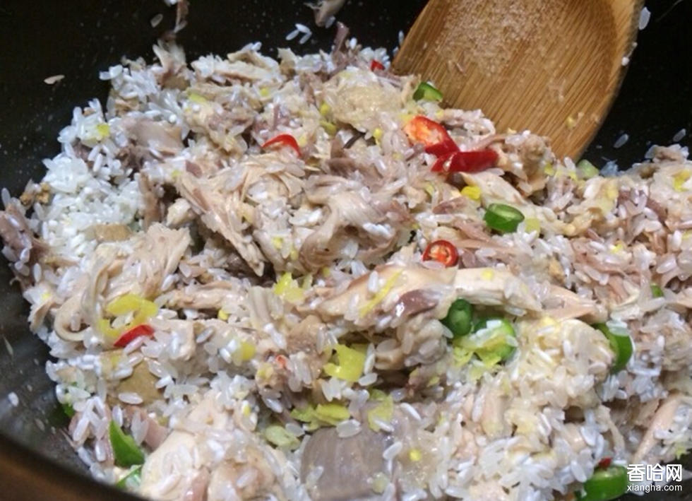 手撕雞肉爛飯的制作程序為:將收拾好的雞體在清水中煮熟,撈出雞后將淘洗好的大米倒入雞湯里煮,稍煮一陣放入一把酸筍,至大米煮爛,稠度在米飯與稀粥之間為止,端下蓋好。這時,用手將煮熟的雞肉撕碎成肉絲塊,將備好的薄荷葉、茴香、香辣蓼等切細(xì)撤在雞絲塊上,再撤上花椒面、食鹽、辣椒面,加以攪拌均勻倒入爛飯調(diào)勻即可上席使用。
