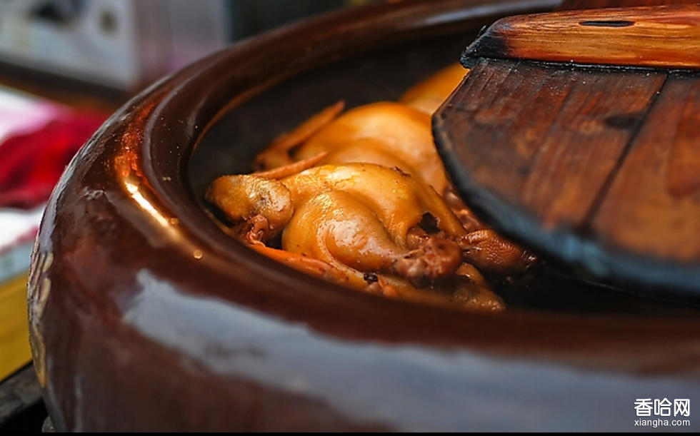 制作過(guò)程:1、將油雞去凈絨毛,剁去爪、頭,拆去骨頭,剁成大塊(約50克),抹以少許醬油,下入燒至8成熱的油炒勺中,炸上色后撈出。2、云腿切成骨牌大小的塊。干貝,將老肉剝?nèi)シ旁谕胫?,加料酒、蔥、姜和適量的水,上屜蒸熟,去蔥、姜待用。3、用熱油將蔥、姜煸香,放入雞塊炒勻,烹入料酒,加上鹽、糖、味精、醬油和適量的水,燒開(kāi)后將雞塊和湯均裝在壇內(nèi)。4、隨即將云腿、干貝、蘑菇,分三堆放于雞塊上,蓋上蓋子,用小火燉50~60分鐘,取下即成。