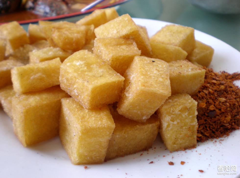油炸豌豆粉是傳統(tǒng)云南省民間小吃,已有了悠久的歷史。吃起來(lái)香脆、鮮嫩,口味佳,令人回味無(wú)窮。豌豆粉是云南當(dāng)?shù)厝耸窒矏?ài)的雜糧制品。大街小巷隨處可見(jiàn)買豌豆粉的小攤子或小鋪?zhàn)?。涼拌豌豆粉是大理比較常見(jiàn)的小吃,還有一種叫稀豆粉,相當(dāng)于液狀的豌豆粉,算是早餐的一種。加入剪好的油條泡在里面,淋上少量當(dāng)?shù)厝颂刂频尼u料和辣子,吃時(shí)灑上椒鹽,熱熱的喝下去,很適合老年人和小孩子做早餐,營(yíng)養(yǎng)還利于消化。