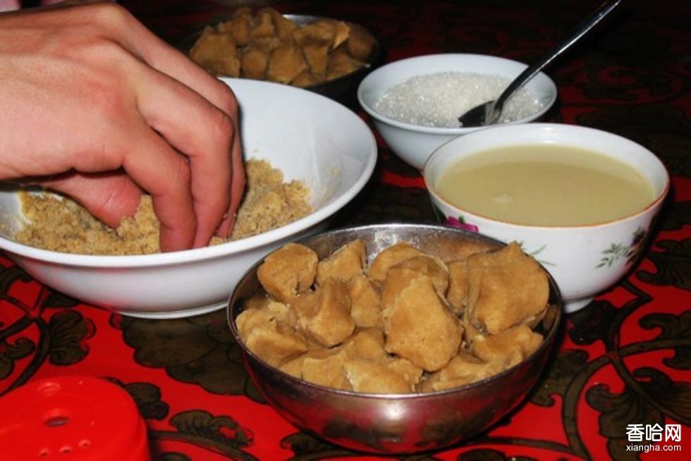 糌粑是藏族牧民傳統(tǒng)主食之一?!棒佤巍笔?u data-WKog="desW4B">炒面的藏語譯音,它是藏族人民天天必吃的主食,在藏族同胞家作客,主人一定會給你雙手端來噴香的奶茶和青稞炒面,金黃的酥油和奶黃的“曲拉”(干酪素)、糖疊疊層層擺滿桌。