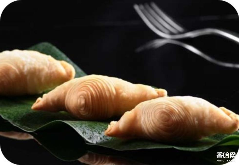 3、逐個(gè)包上洗沙餡成半圓形,抄兩角,鎖成繩邊后放入豬油鍋內(nèi),文火浸炸而成。