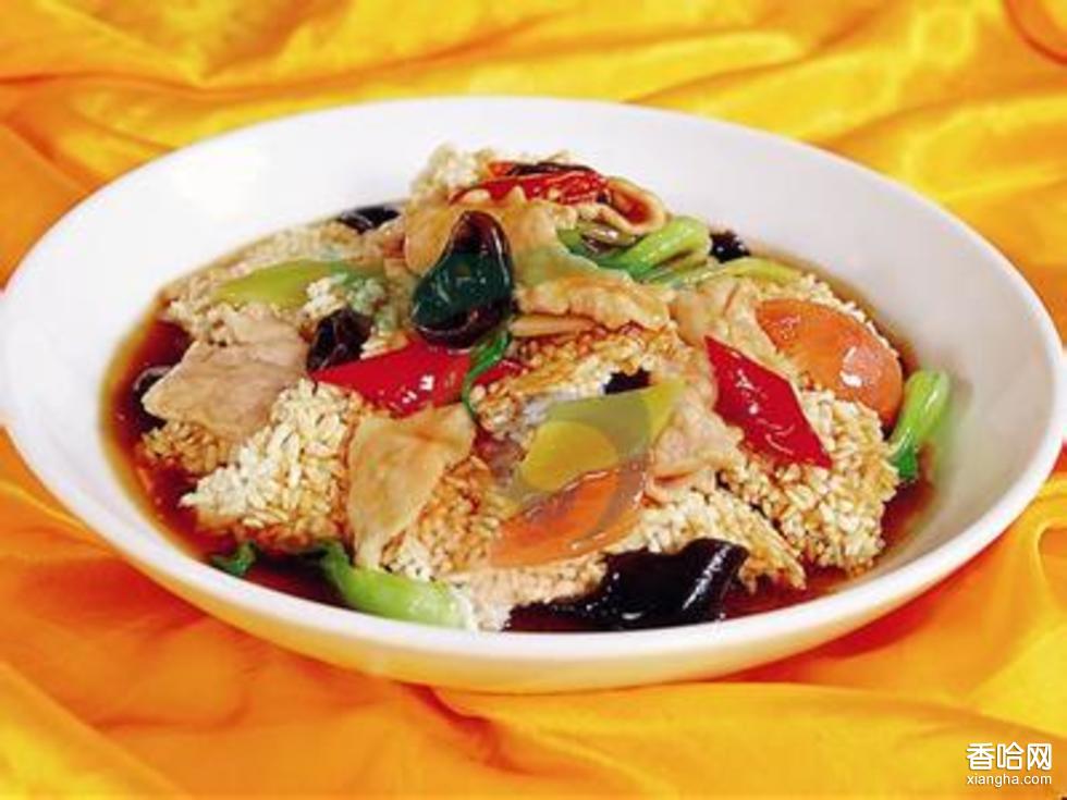 鍋巴肉片,是四川風(fēng)味名菜。以鍋巴作菜肴,早在清代已有。乾隆皇帝下江南,在江蘇品嘗此菜以后,曾御賜"天下第一菜"和"平地一聲雷"的美名?!冻啥纪ㄓ[》也記載當(dāng)時著名的"醉霞軒"、"味珍園"等餐館供應(yīng)"鍋巴海參"等菜肴??箲?zhàn)時,重慶等地的餐館又盛行"鍋巴肉片"數(shù)十年來,此菜一直深受顧客歡迎。