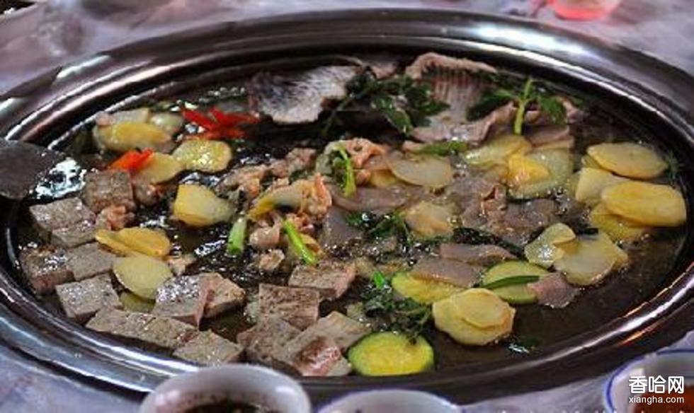 原料:土豆適量、食用蔬菜(如蓮花白、芹菜等)適量,肉類(豬肉、牛肉、魚肉、無頭魚、雞雜、雞皮等)適量、各肉類半成品,菌類(金針菇、野菌、雞棕等)臭豆腐、堿豆腐、魔芋豆腐、 調(diào)料:熟菜油、辣椒面、花椒、花生仁、芝麻、鹽、味精。制作方法:1、辣椒面做法。將花生、芝麻炒熟后,與辣椒面、花椒一齊搗成粉末狀,加入適量鹽和味精。其中,花生等佐料與辣椒的比例為2比3。配好后,將辣椒面放入小碟中。2、將菜油倒適量入準備好的淺口平底鍋中或者特制的土制沙鍋中,等油加熱到五分熱時,將蔬菜倒入鍋中反復(fù)烙至熟透;在加入肉類時,要先將肉類用醬油、少量芡粉拌好,等油加熱到八分熱時,放入鍋中,反復(fù)烙至熟。食用時用烙好的食品蘸取適量的配制好的辣椒面即可食用。風(fēng)味特色:香辣爽口,味道奇香,開胃可口,油大不膩,獲得“西部名小吃”稱號。技術(shù)要領(lǐng):辣椒面的配制要控制好比例,烙制蔬菜與肉類時注意區(qū)分火候。