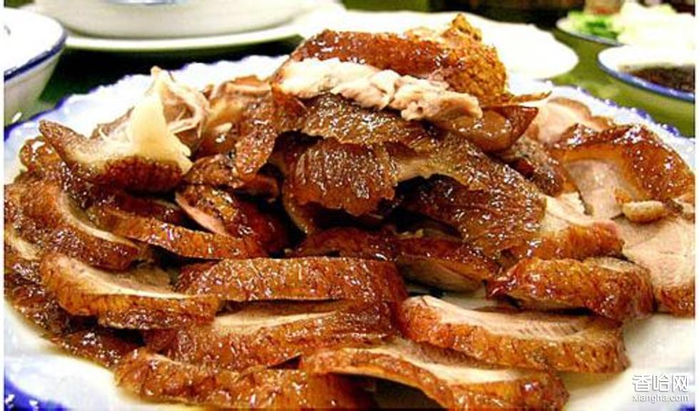 4、將鹵熟的鴨子撈起控干水分,用滾油一勺勺的淋熟至皮酥且呈棕紅色時(shí)撈出,刷上飴糖即成。