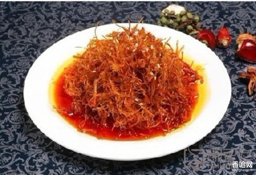 2、將牛肉絲放入油鍋內(nèi)炸酥撈出,加入白糖、味精、紅油辣椒、花椒油、香油拌勻,裝盤(pán)即成。