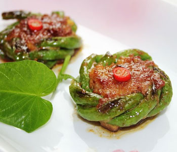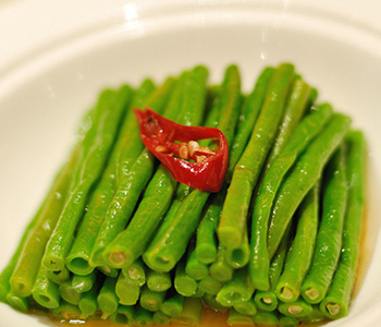 (4)起鍋,油燒開,倒豆角,翻炒一下到紅椒蒜蓉,加芡汁,收汁馬上舀出。