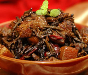 (6)再放入處理好的干豆角,翻勻,加適量鹽調(diào)味,繼續(xù)燉約20分鐘后,大火收干汁即可。
