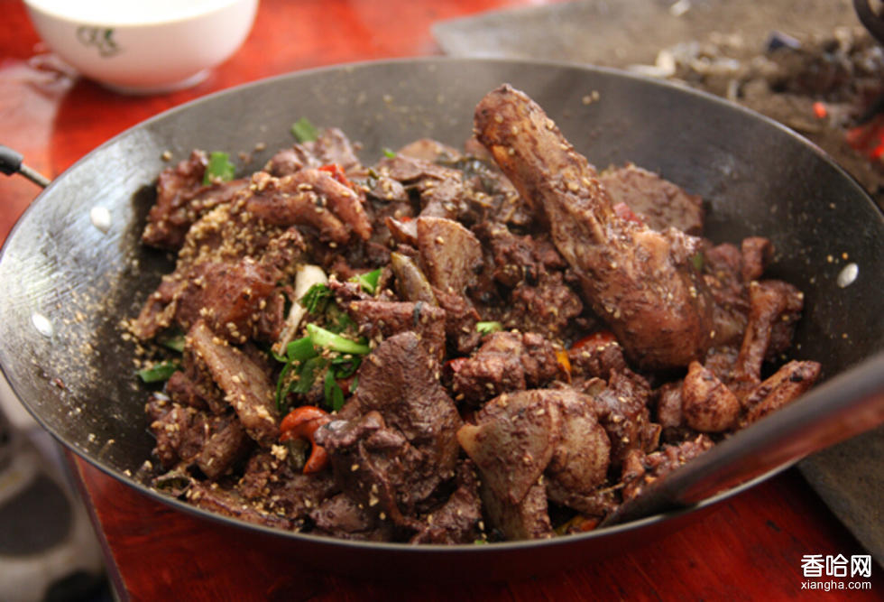 配料:1、根據(jù)食者口味選主配料(或苦瓜,或魔芋豆腐,或娥眉豆,或嫩南瓜,或白桿芋苗0.8-1公斤)切塊2、根據(jù)鴨的肥瘦備五花肉0.4-0.6公斤切塊;3、備香炒花生米2兩、芝麻1兩混擂成粉;4、根據(jù)食者口味備鮮辣椒或酸辣椒若干切碎;5、生姜絲20克、鮮花椒籽20粒,蒜頭10粒共拍碎;6、鮮茴香葉(或鮮紫蘇葉)20克?;鸷颍簩Ⅷ喩砩习逵途珶捄?,再放入五花肉煉炒至肉中油出1/3時(shí)?;?,鍋底油液保持在100克左右(多者倒出),繼將豆豉、生姜、花椒、蒜泥入鍋爆炒(如用酸辣椒者,此時(shí)同炒,鮮辣椒則與主配料同放),待滿屋生香時(shí)加入鴨肉后蓋鍋燜煮(切忌翻炒),燜約5 分鐘翻炒后,視鴨齡長(zhǎng)短及火力大小燜10分鐘左右,加入主配料續(xù)燜至鍋底見(jiàn)油不見(jiàn)湯,主配料半爛狀時(shí)下鍋冷卻1-2分鐘,再加入醋血、茴香或紫蘇葉繼開(kāi)火翻炒2-3分鐘,關(guān)火,再加入花生、芝麻粉勻拌即可出鍋。