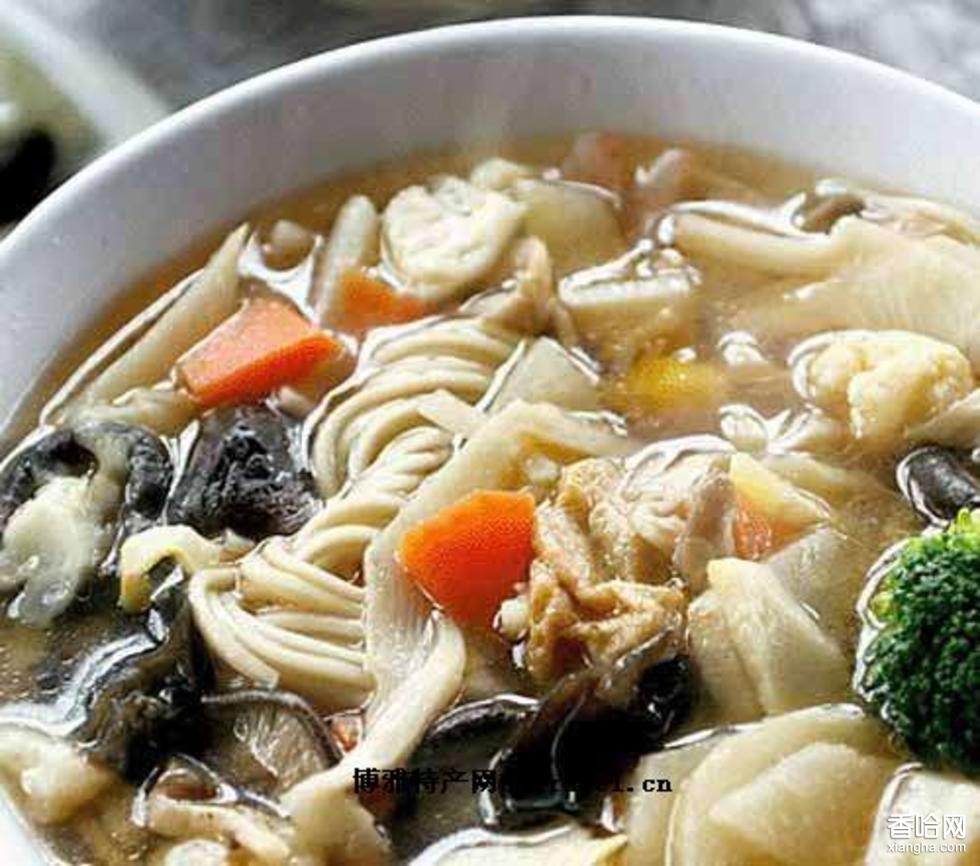 制作方法:1、熬湯:用黃豆芽、新鮮草菇、香菇、冬筍久熬而成。2、面條用清水煮熟裝碗,將湯放入。3、再加上桂林腐竹、黃菜、素火腿、面筋等素菜和佐料即可食用。尼姑面,以黃豆芽、草菇、香菇腳、冬筍等熬制成色黃清亮、香氣噴鼻的湯;選取上好的精白粉,用手工精 制成粗細(xì)均勻,光滑柔膩的面條。煮面時(shí),先用清水煮至七成熟,而后撈至熬好的湯里煮熟。面條盛入碗后,再在上面蓋上草菇、素火腿、面筋等素食鮮,滴上香油、撒上花生糜、胡椒粉。吃起來(lái)清淡可口,味道鮮美,余香纏綿。