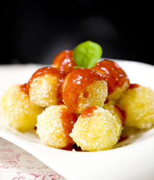 7、鍋中留少許油加入番茄醬,帶番茄醬冒泡時(shí)澆入炸好的土豆球上即可食用。