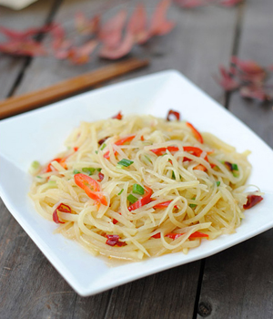 9、煸炒一小會(huì)后倒入適量醋繼續(xù)翻炒土豆絲。