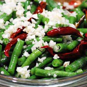 原料:豇豆、大蒜、蔥、熟白芝麻、干辣椒、鹽、味精。
