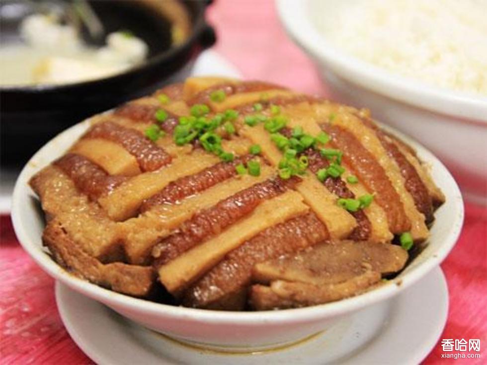 賀州的扣肉屬黃田最有名,主要材料是芋頭和五花肉。一直以來黃田扣肉都是黃田“二月二”宴席上必不可少的一道菜。黃田扣肉與眾不同的地方一個是“雙扣”,也就是兩塊沒有切斷的五花肉將油炸過的芋頭包在里面,一般采用的都是五花肉,看起來似乎很肥,但是吃起來清爽不膩,入口即化;另一個不同點是加入了冰糖,扣肉吃起來很甜,可是甜而不膩,口感十分獨特,跟家里平時做的芋頭扣肉不太一樣。