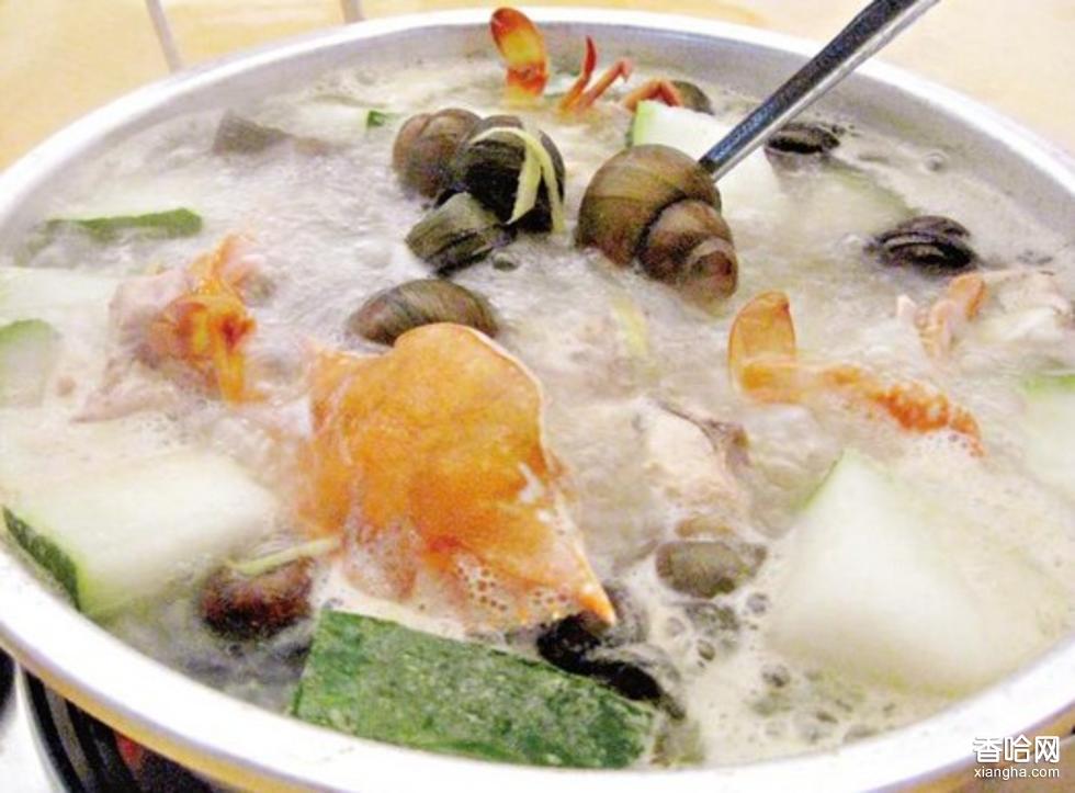 海鮮大肉田螺是廣西玉林十大特色小吃之一,先上好的大田螺,敲掉螺尾煮熟,將豬肉、木耳等配料剁成餡釀入田螺內,再和雞肉、螃蟹一同下鍋煮熟即可。其特點是味美鮮甜,營養(yǎng)豐富。