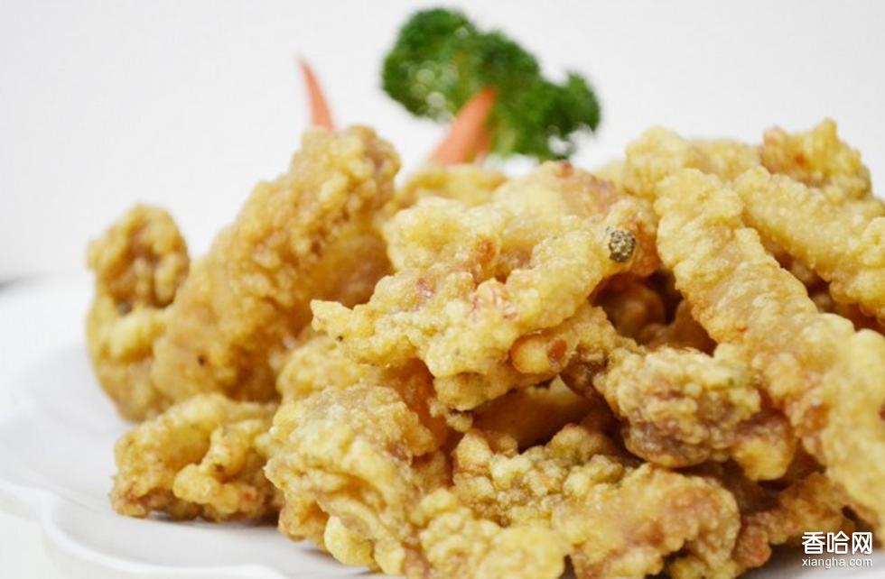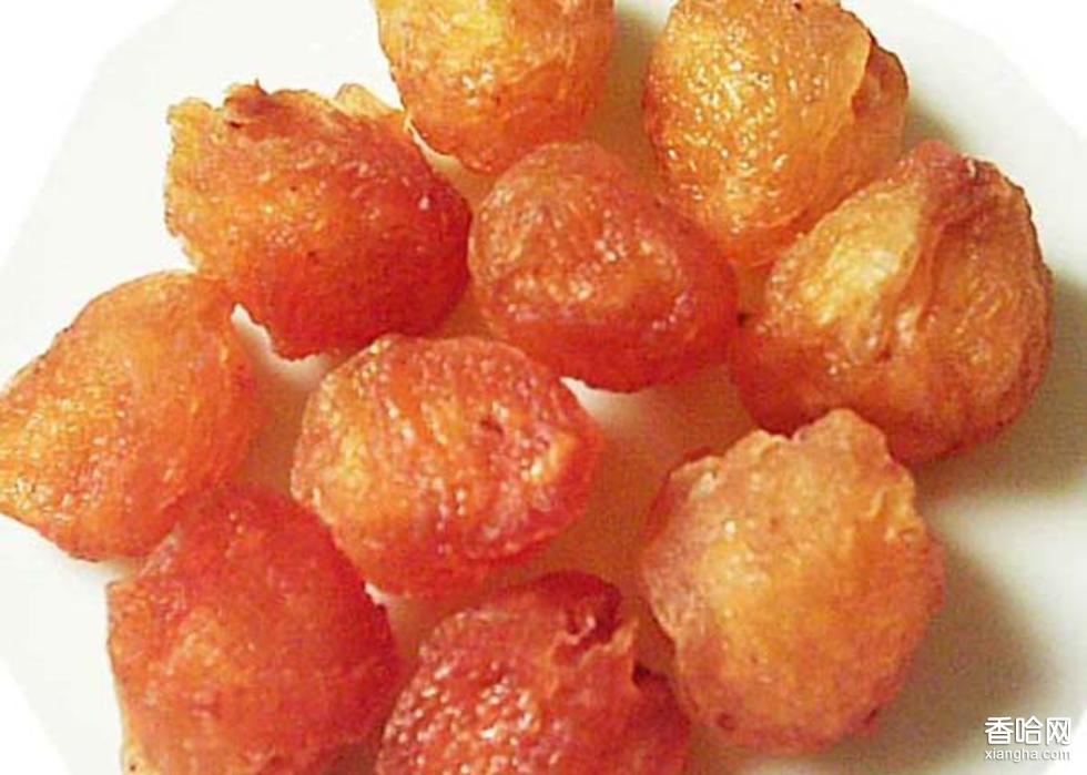 5、拖糖水。把干爽的白散胚在已煮好的糖(白糖或黃糖)水中,浸勻后即撈起,叫拖糖水;要掌握糖水的濃度,過稀則不甜,過濃則使白散在油炸時不散,一般糖和水的比例以三比一為宜;拖糖后的白散胚要曬干,置容器中密封待炸。