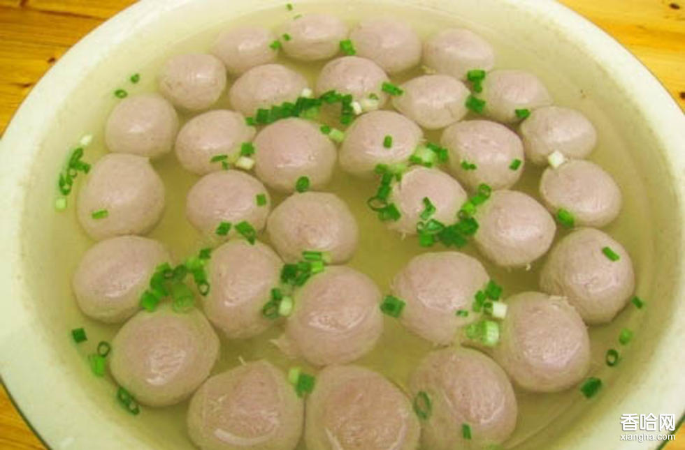先要精選新鮮的黃牛后腿嫩肉,剔去肉筋,切成肉條,然后置一光滑的青石板上,用硬木槌把肉條捶得糜爛,變成肉醬,使之起膠,再加進鹽油并少量枧水、適量生粉和一點點胡椒,又邊捶邊拌和,把它捶成“肉膏”狀,再用手抓起肉醬團用力摜甩于瓦 內,如此反復多次,直至扯開肉醬又突然放手,它能迅速自動縮回原狀為度。這樣做出的肉丸爽脆而有彈性。接著將做好的生肉丸置開水鍋中速煮,讓其先沉后浮,撈起再進油鍋稍炸(煮)一下。炸(煮)時,一見肉丸膨脹,即要撈出。吃時再放入靚湯中稍煮,配以少許生抽、蕪荽等香料,那是色、香、味俱佳。在玉林,還有將此種肉丸配入米粉,或再加進一點點玉林特產“豉油膏”,這叫“肉蛋粉”,吃來更有地方風味。