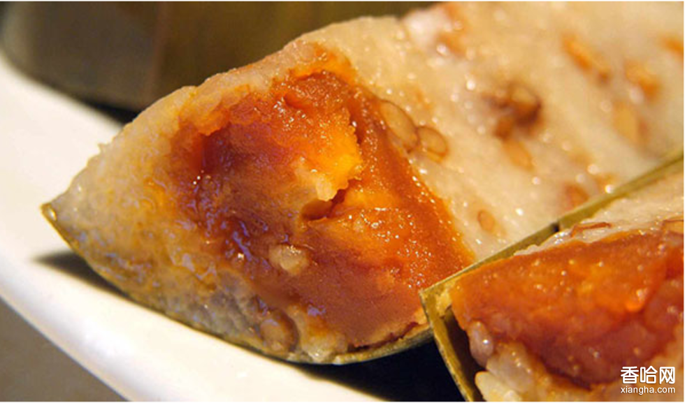 糯米洗凈,用微量精鹽、生油、拌勻,夾以燒腩肉(粵菜中一種燒臘制品)、咸蛋黃,用圓水草綁扎;粽呈圓筒狀,兩頭交錯(cuò)一字平口,一般直徑12厘米,長30厘米。先燒滾水,放入粽,文火煮4小時(shí),中間添些開水,收火浸于湯內(nèi)4小時(shí),前后要在開水中燒上10個(gè)小時(shí),食之味香韌滑。