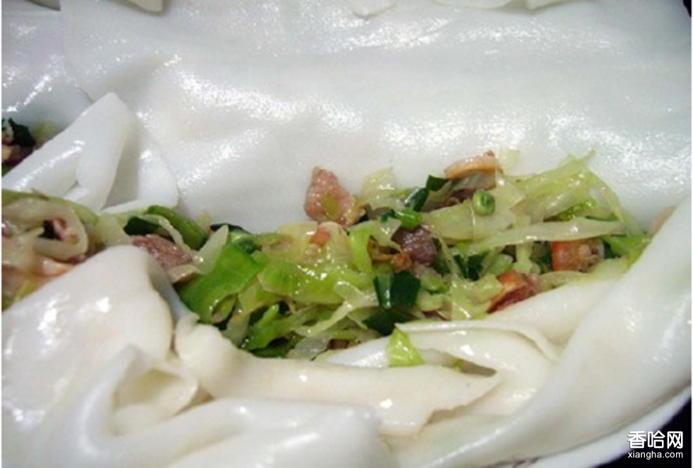 2.然后是蒸腸粉。腸粉蒸好后,對(duì)稱(chēng)切開(kāi)成兩個(gè)長(zhǎng)方形,寬度約為二十厘米,將油條放在切開(kāi)的3.一邊腸粉中,用腸粉包卷油條。