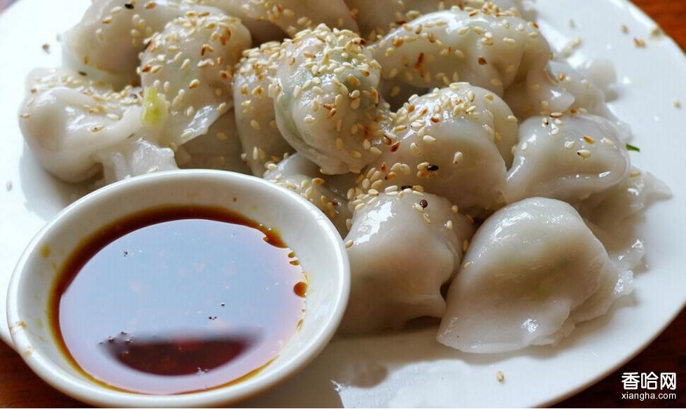 東陂水角的制作過(guò)程相當(dāng)講究。須預(yù)先訂制一口“鼎”樣的大鍋,底斜平、直身,比大飯鼎還闊大,而直身高度稍矮。砌置灶上,灶面要寬,以便易于操作。先制作水角糍皮,將預(yù)先選好的上乘:—等油粘米(粳米8至10斤)洗凈浸透,磨漿,米漿愈細(xì)愈好。然后大鍋灶下干柴燒火,用熟油煎鍋兩次,把米漿倒進(jìn)鍋內(nèi)加溫,等米漿稍熱,使用一條頭粗尾細(xì)的硬木檑杵圓周搗拌,鍋下繼續(xù)燒火,米漿越搗拌越稠,也越費(fèi)力,最后,稠糍粘在檑杵上,往鍋里再放少許豬油,繼續(xù)搗圓周,于是米糍已成半熟;全部粘在檑杵上,便可取出置于臺(tái)板上,加些小米粉,分開(kāi)小團(tuán)揉搓均勻,用濕巾蓋住,以免干裂。用時(shí)再掰成拇指大小的糍,用圓木面杖來(lái)回?fù){碾,使之成碗口大小的圓片,這就是包餡的糍皮。做餡的料是精肉、馬蹄,蔥白。先把精肉配以白糖、醬油,生粉、茶油、姜汁腌好;馬蹄去皮拍碎剁爛:蔥白切成米粒大小,三料和在一起均勻混合,整水角放餡時(shí),每一只水角放進(jìn)一粒白胡椒。然后,用手工把糍皮包裹肉餡,水角樣子既像北方的餃子,也像南方的蝦狗,這就是水角。一個(gè)個(gè)水角放在小圓篩上,裝滿(mǎn)一篩,放進(jìn)水鍋里蒸20分鐘,取出,將篩用圓板蓋住,反轉(zhuǎn)過(guò)來(lái),去篩,用薄片迭進(jìn)盤(pán)碟,面上涂遍香熟油、麻油,播撒一層炒香的白芝麻,放上兩根翠綠的香絲芫荽,色香味俱全。