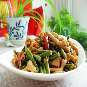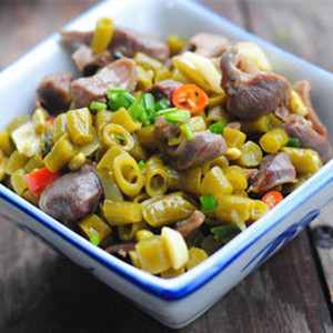 原料:鴨腸、酸豇豆、尖椒、色拉油、食鹽、蒜、花椒、干辣椒、老抽、啤酒。
