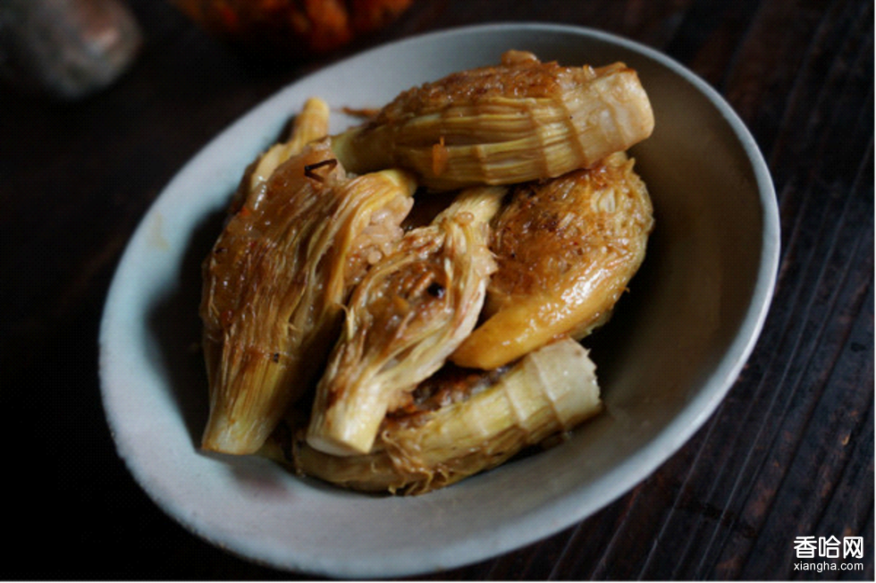 如果你到岑溪來(lái),熱情淳樸的岑溪人定會(huì)拿出這道美味可口的佳肴款待你。其制作簡(jiǎn)單易行,有興趣者不妨一試。用料:以選用山蒲筍為最好,要先將采回的細(xì)嫩的生竹筍去殼后放進(jìn)盛半滿水的鍋里用猛火煮半個(gè)鐘頭左右,再撈出來(lái)放進(jìn)冷水浸泡約5小時(shí),然后就可將竹筍撈起放到竹篩里用手揉搓,使之苦澀味蕩然無(wú)存。另外準(zhǔn)備好適量的豬肉、食鹽、醬油、花生油、韭菜、茴香、芫荽、生粉、白糖、芝麻等原料。制作步驟第一步:先去除苦澀味的竹筍,切成兩寸長(zhǎng)左右后,再用牙簽劃成一條條均勻適度的筍絲。第二步:剁肉餡。先將肥瘦適中的豬肉切成肉片,再加入洗好的茴香、韭菜、芫荽等佐料,然后調(diào)入適量的食鹽、生粉、醬油等調(diào)味料拌和剁成肉末。第三步:將已劃好的一條條筍絲團(tuán)團(tuán)包住剁好的肉餡,盡量包得密實(shí)精致一些,每個(gè)約半個(gè)拳頭大左右即可。第四步:煎竹筍釀。凈鍋內(nèi)加油燒熱,再輕輕放入包好的竹筍釀,蓋上鍋蓋用文火慢慢煎。在煎的過(guò)程中要注意適時(shí)翻動(dòng),并不時(shí)從鍋的四周添入適量的花生油及少許的清水,以避免粘底變焦走味。待竹筍釀的兩面呈金黃色,就可均勻澆上芝麻、胡椒、生粉、醬油等調(diào)和成的味汁,鏟起盤中就可食用了。特點(diǎn):色澤金黃,香氣撲鼻,原汁原味,吃起來(lái)爽滑可口、油而不膩,令人回味無(wú)窮。
