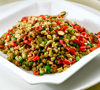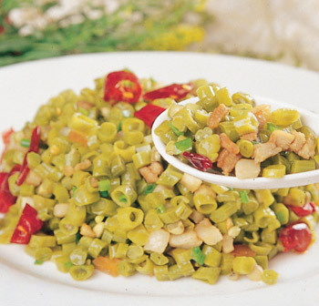 5 最后倒入切碎的酸豇豆,翻炒均勻后加入適量的水。待湯汁快干之時放入味精,即可出鍋。