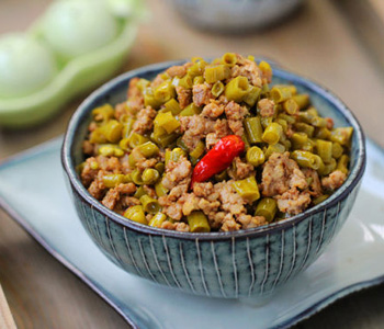 主料:酸豇豆適量、豬肉餡適量、干辣椒段適量、姜碎適量、蔥白末適量