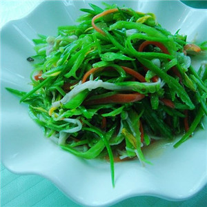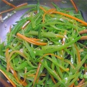 具體做法:把新鮮挑選的荷蘭豆擇去老筋洗凈,胡蘿卜去皮清洗干凈,這個(gè)用法添加的胡蘿卜是因?yàn)楹}卜可以做成的涼拌荷蘭豆紅綠相間,賣相更好看。鍋內(nèi)水燒開后放入荷蘭豆焯水。把焯過水的荷蘭豆放入涼水中過涼備用。荷蘭豆和胡蘿卜切成絲后,把切好的絲放入小盆中,放入蒜末、香油、味精、鹽、少許醋和糖。最后攪拌均勻就可以了。
