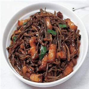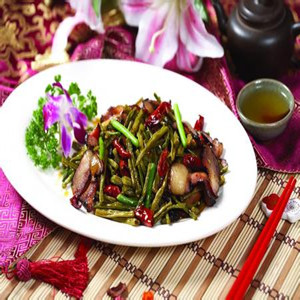 食材:干豇豆,醬油, 糖, 酒, 姜絲,雞湯,胡蘿卜絲,青辣椒絲,干辣椒,麻油,耗油
