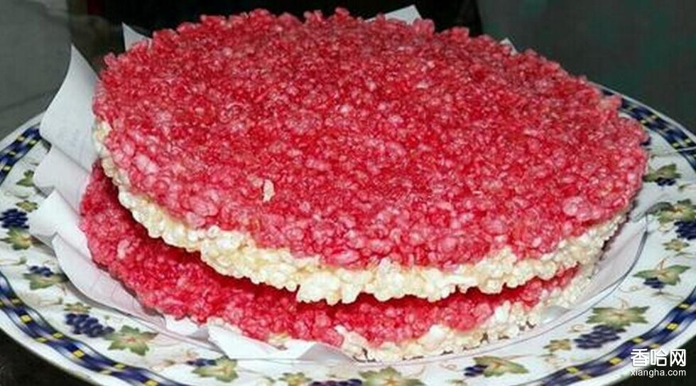 是用糯米飯制成的,其制作方法是將糯米淘洗數(shù)次,放置清水中浸泡發(fā)脹后,分成兩半,其中一半拌上食品紅,一并置于甑內(nèi)(中間用隔板間開)蒸熟。然后取出攤在一個碗口大小的篾箍內(nèi),使之粘合平整均勻。每個米花約1cm厚,由紅、白兩層組成,上層為紅米飯。將做好的米花擺在篾墊或木板上,放在陽光下曬干。白色底層若碎玉鋪就,紅色面層如瑪瑙嵌成,遠(yuǎn)遠(yuǎn)看去,像艷麗的花朵,故稱之為“米花”。