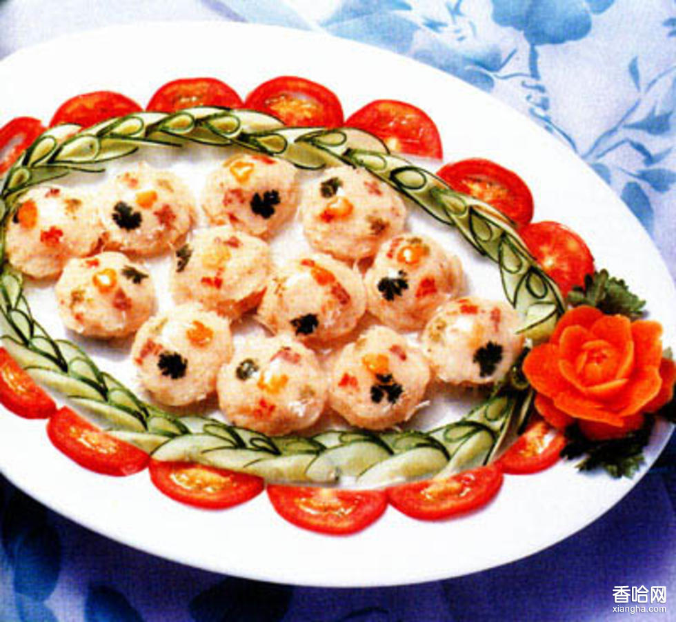 4、將一串蝦膠分別釀在20個小碟上(小碟要先涂上豬油),然后將魚翅放在蝦膠上面,又一次釀上蝦膠,再用蛋白抹滑,放上火腿末,芫荽葉、芹菜末、金筍花,放入蒸籠用旺火炊熟,取出魚翅,擺砌盤間,把原湯約100克調(diào)上味,用生粉水勾芡淋上即成。