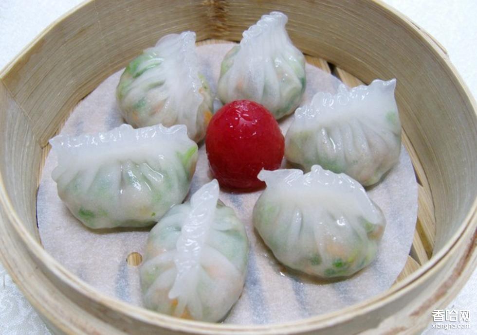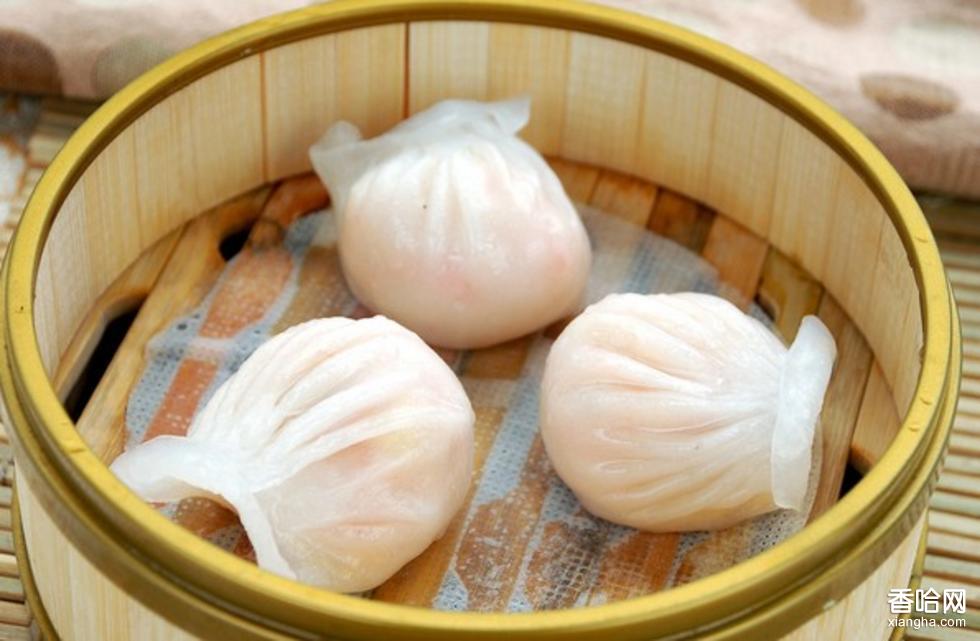蝦餃在制作上較為講究,將澄面、生粉制成蝦餃皮;鮮蝦洗凈去殼吸干水分壓爛攪拌成肉膠,肥肉切成細(xì)粒,用開(kāi)水燙至剛熟,再用清水浸過(guò),使肥肉既爽而又不致出油;加入雞蛋白、細(xì)筍絲、味粉、麻油、胡椒粉等配料,經(jīng)冷凍后制成蝦餃蒸熟。蝦餃片薄而半透明,皮內(nèi)鮮餃餡料隱約可見(jiàn),形似一梳香蕉。由于外形美觀,味道鮮美爽滑,美味可口,深受海內(nèi)外食客贊譽(yù)。近十年推出的雞粒蝦餃、蟹黃蝦餃等新品種更受食客的青睞。