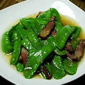 臘味荷蘭豆,制作材料:荷蘭豆150克、臘腸50克,鹽,味精,大蔥,姜,料酒,植物油40克,淀粉(豌豆)等