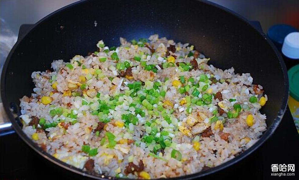 5調(diào)味料拌勻以后加入之前煲熟的米飯進去翻炒。