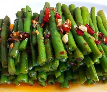 3、川香豇豆,豇豆洗凈,切長段備用。炒鍋加入植物油,燒至八成熱,下入豇豆端油炸,當(dāng)豇豆段開始變的油綠的時候即可停止油炸,將豇豆段撈出瀝油備用。鍋內(nèi)留底油,下入青花椒、花椒炸香,下入大蒜和干辣椒煸香,將炸好的豇豆段倒入鍋內(nèi)翻炒,加入蠔油、食鹽翻炒均勻入味后,加入白芝麻,最后加入雞精調(diào)好味即可關(guān)火,裝盤上桌食用。